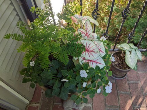 And this was the flowerpot on the steps this year. The pots worked well, but the railing planters were a mess: very dry, and I didn’t have any good fillers or spillers. I’ll add Soil Moist next year and go for something easy like calibrachoa to add color.