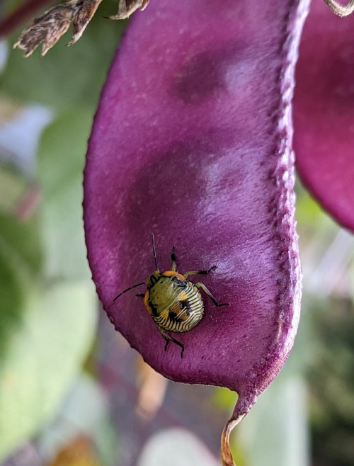Finally, the hyacinth beans I got on sale from C&T did pretty well, though what is apparently a stinkbug larva liked them, too. Never mind, the colors were delicious.