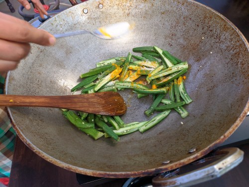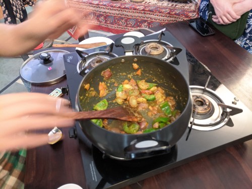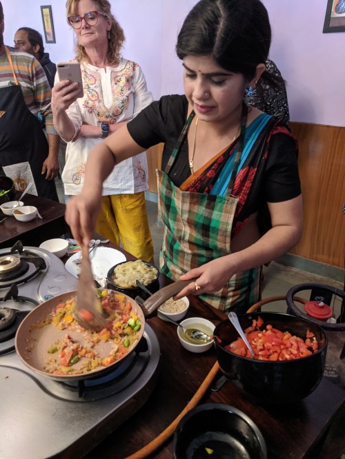 Together with a helper who rushed over with the needed ingredient when called for, they demo’d several dishes to us: cauliflower with turmeric and tomatoes, roasted eggplant in spices, okra, and more.
