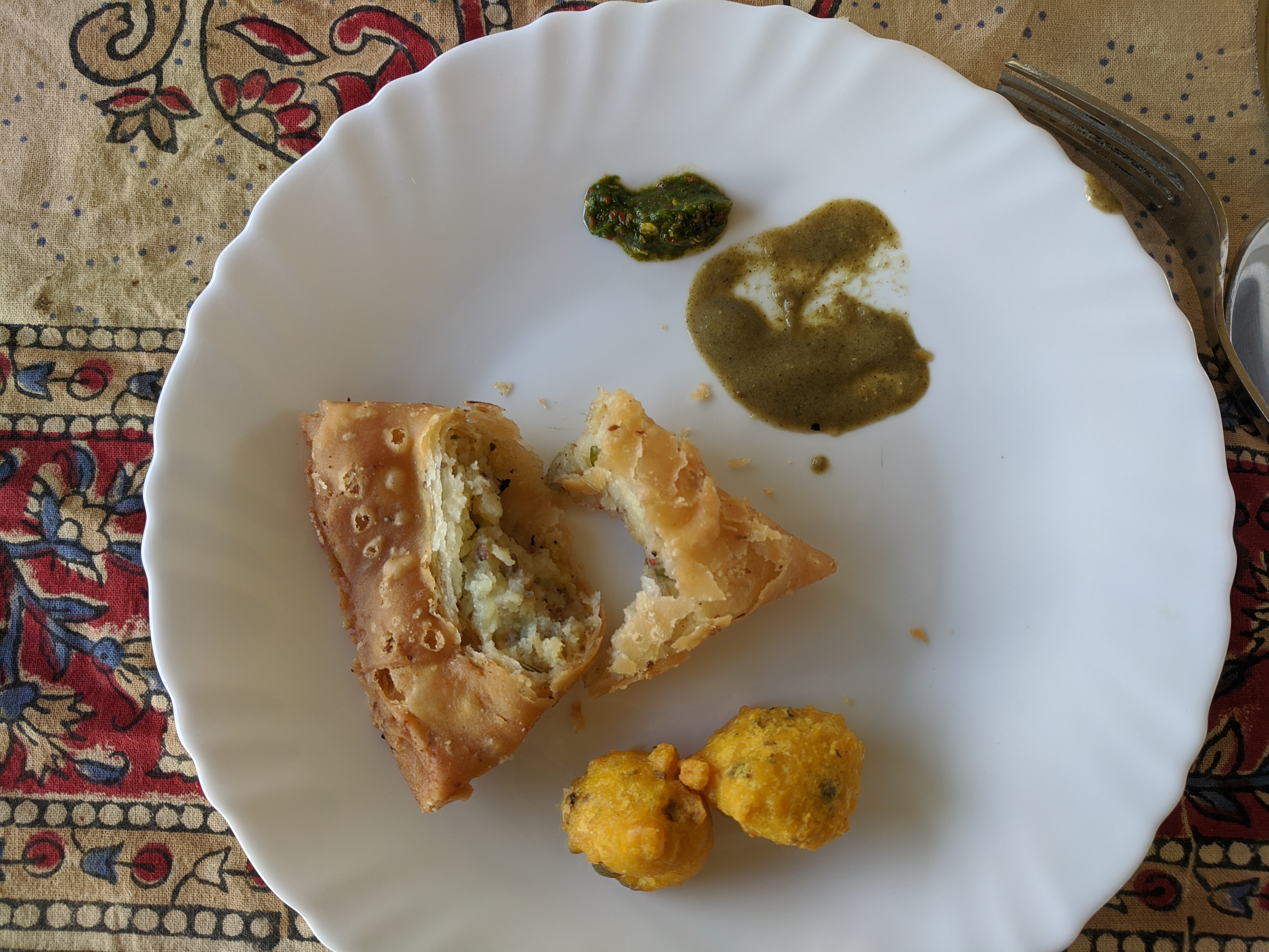 Appetizers of delicate samosas and something fried served with two chutneys,