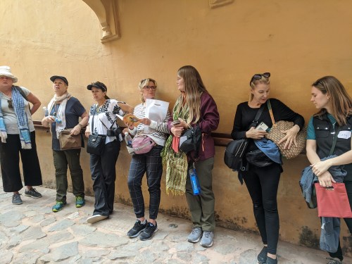 A dramatic view over the terrace almost straight down to the sea crashing below, and semi-tropical gardens terraced along the sides. I sat next to the Lord on the ferry across – Mom noticed his beautifully made shoes – and we met him again on the tour.