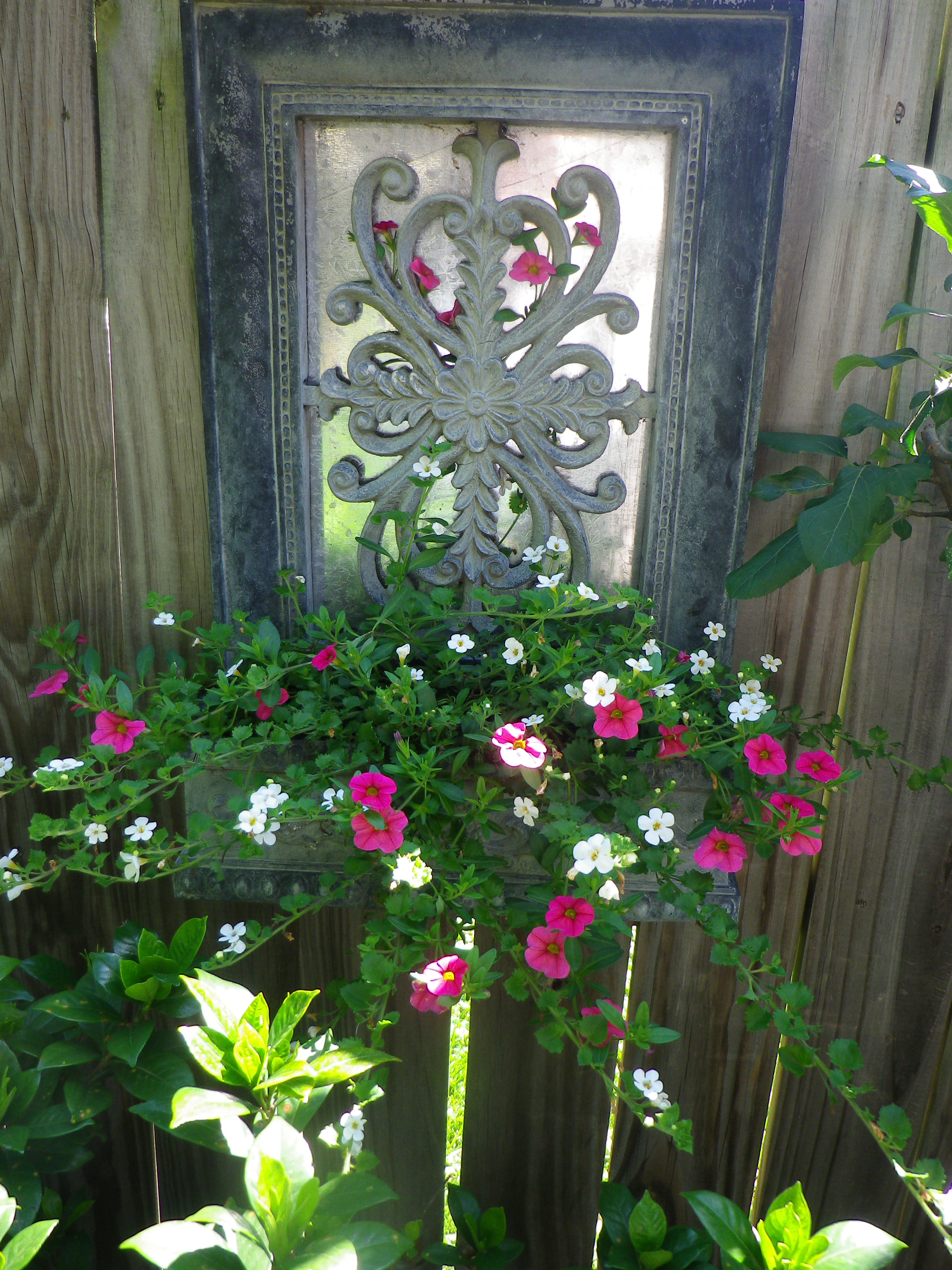 We enjoyed the other gardens, too. This one had a particularly beautiful planter. Notice how the blossoms are twining up under the ironwork.