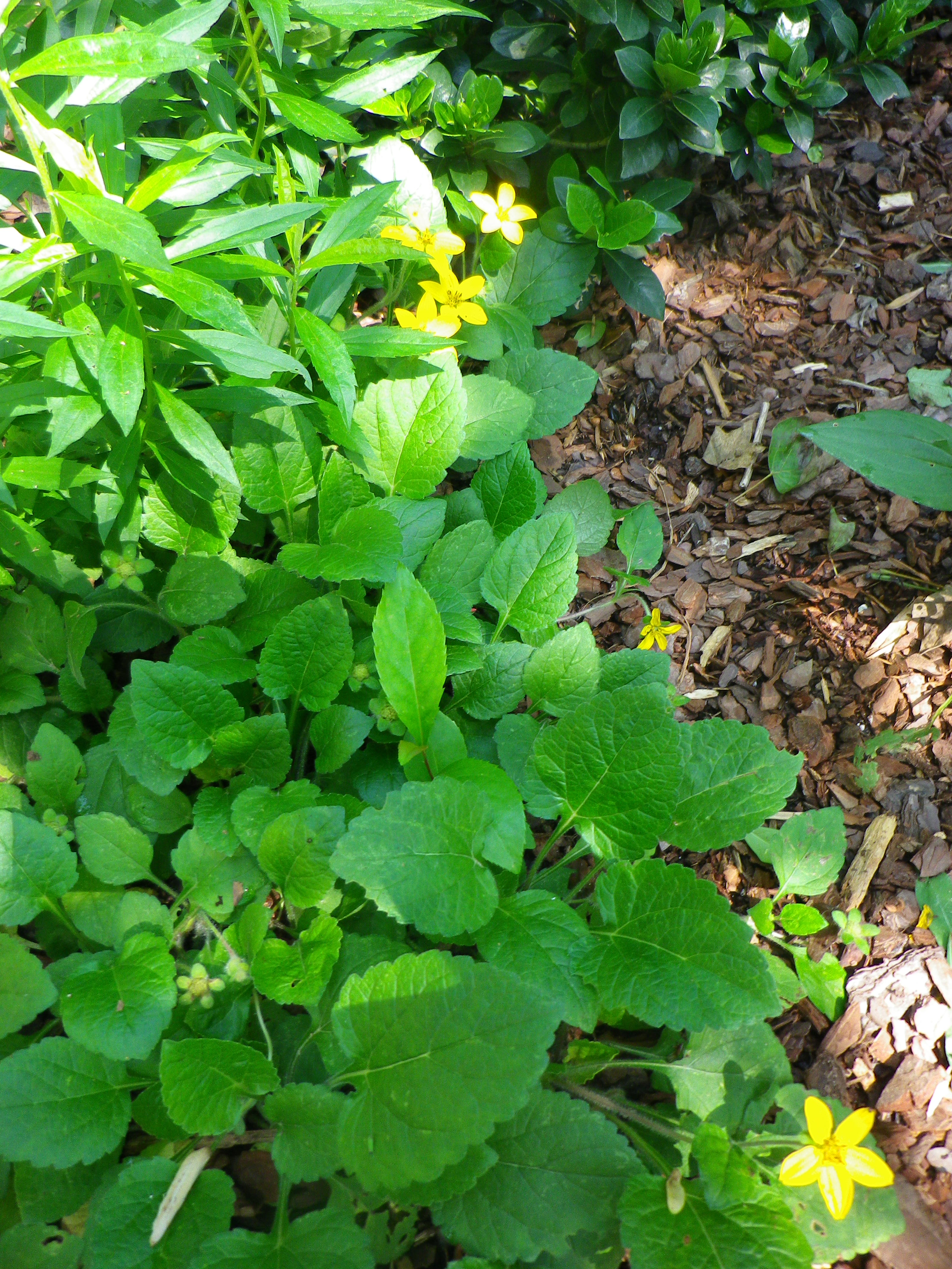 She also had lots of golden star, aka Chrysogonum virginianum. There’s a variety called ‘Allen Bush’ that seems to be a good one. It likes shade and blooms for about a month. (This is one of the virtues of this tour – the actual gardeners are on site and can tell you all about everything.)
